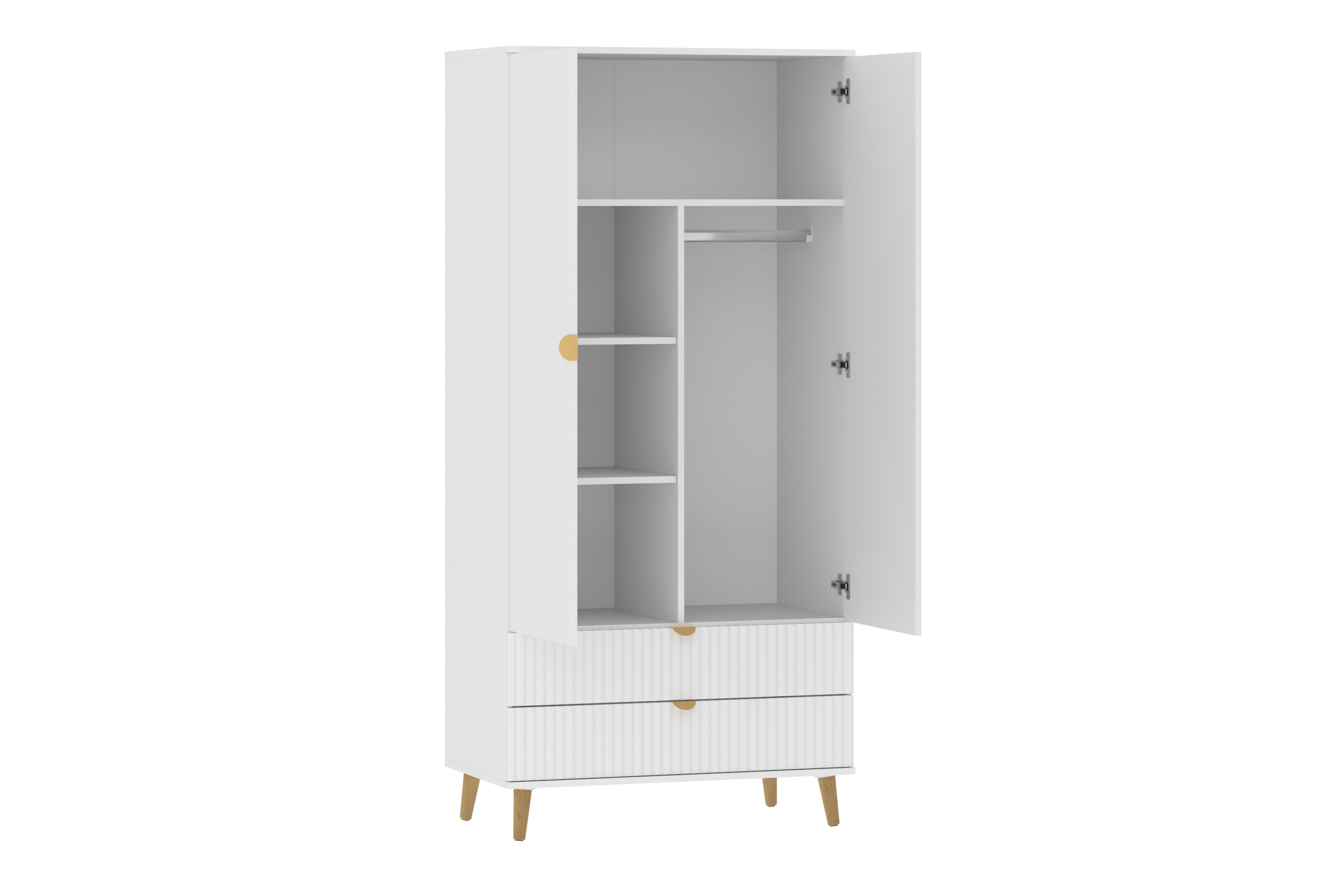 выдвижными ящиками. За двумя распашными дверьми овальная штанга и полки.