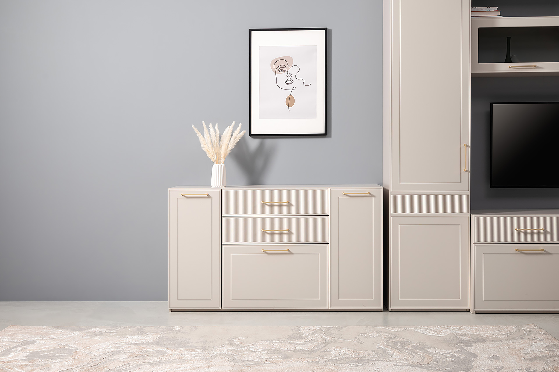 Тумба под ТВ Ричфорд 16.61 кашемир 5981 BS, моно керамика D166-2 ПВХ, белый PE шагрень
