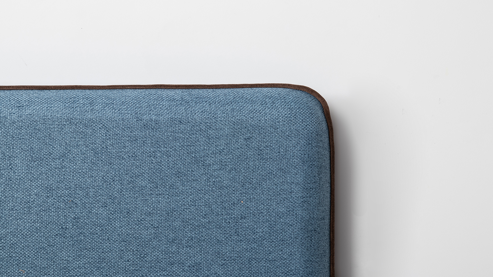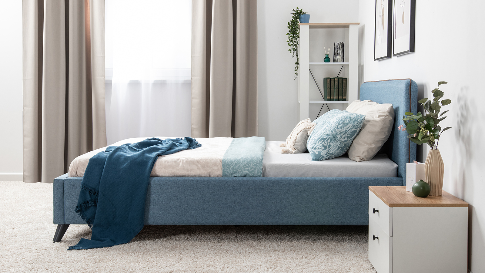 Кровать Миа 180 светло-синий, кант желтовато-коричневый с ортопедическим основанием и подъемным механизмом