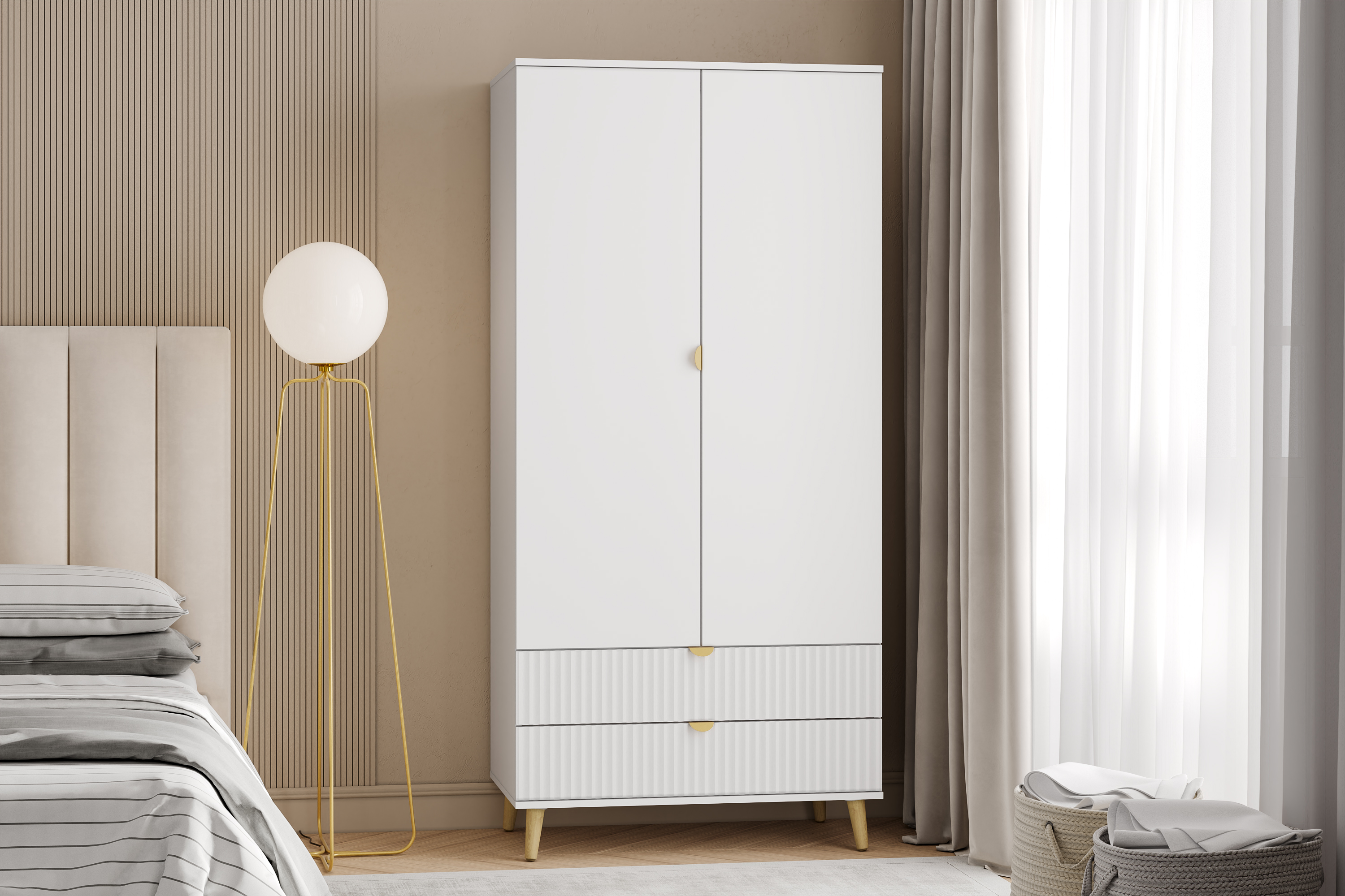 Шкаф оснащен двумя выдвижными ящиками, которые открываются плавно и бесшумно благодаря шариковым направляющим, полками, а также овальной штангой для организации предметов гардероба, а высокие опоры облегчают процесс уборки.