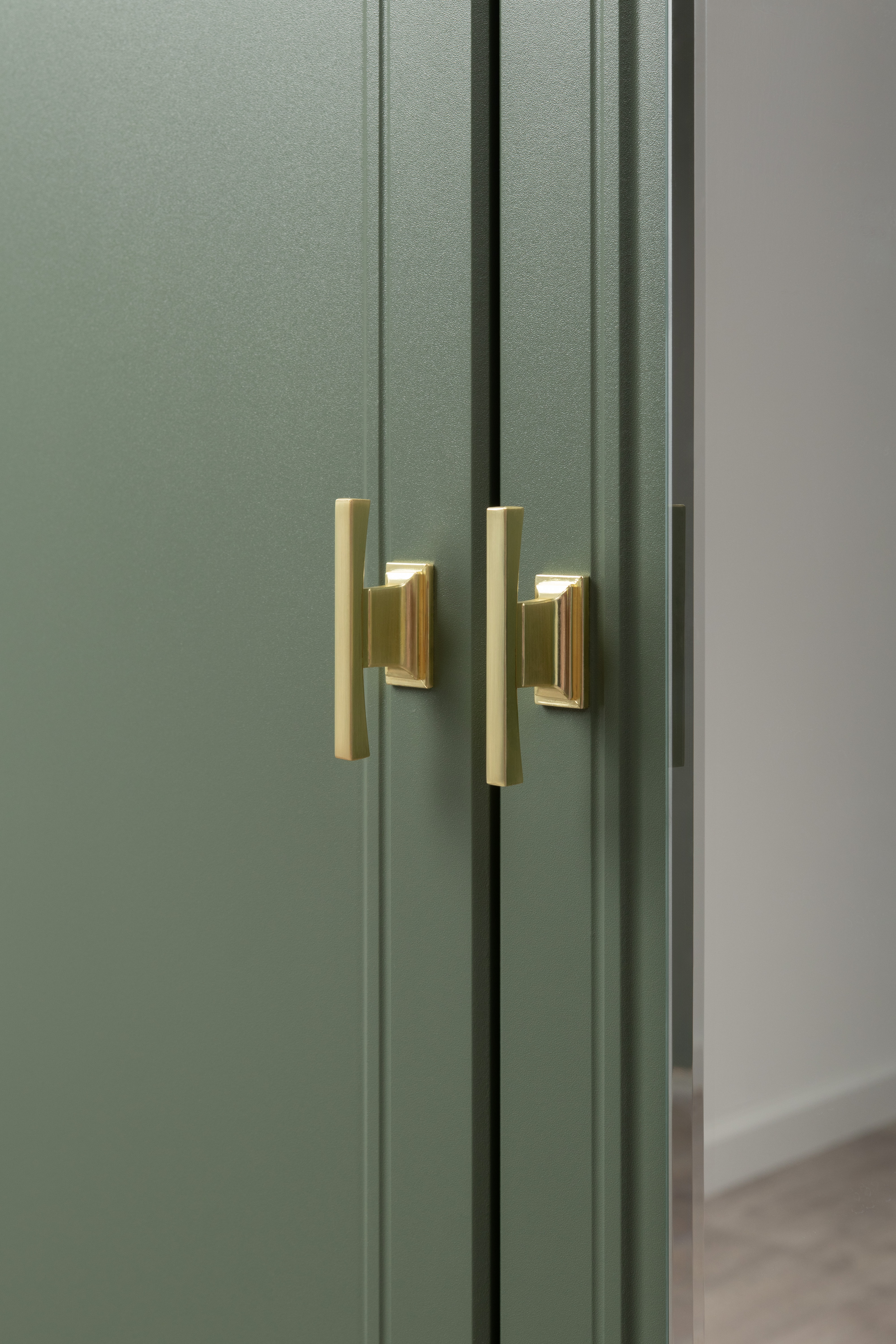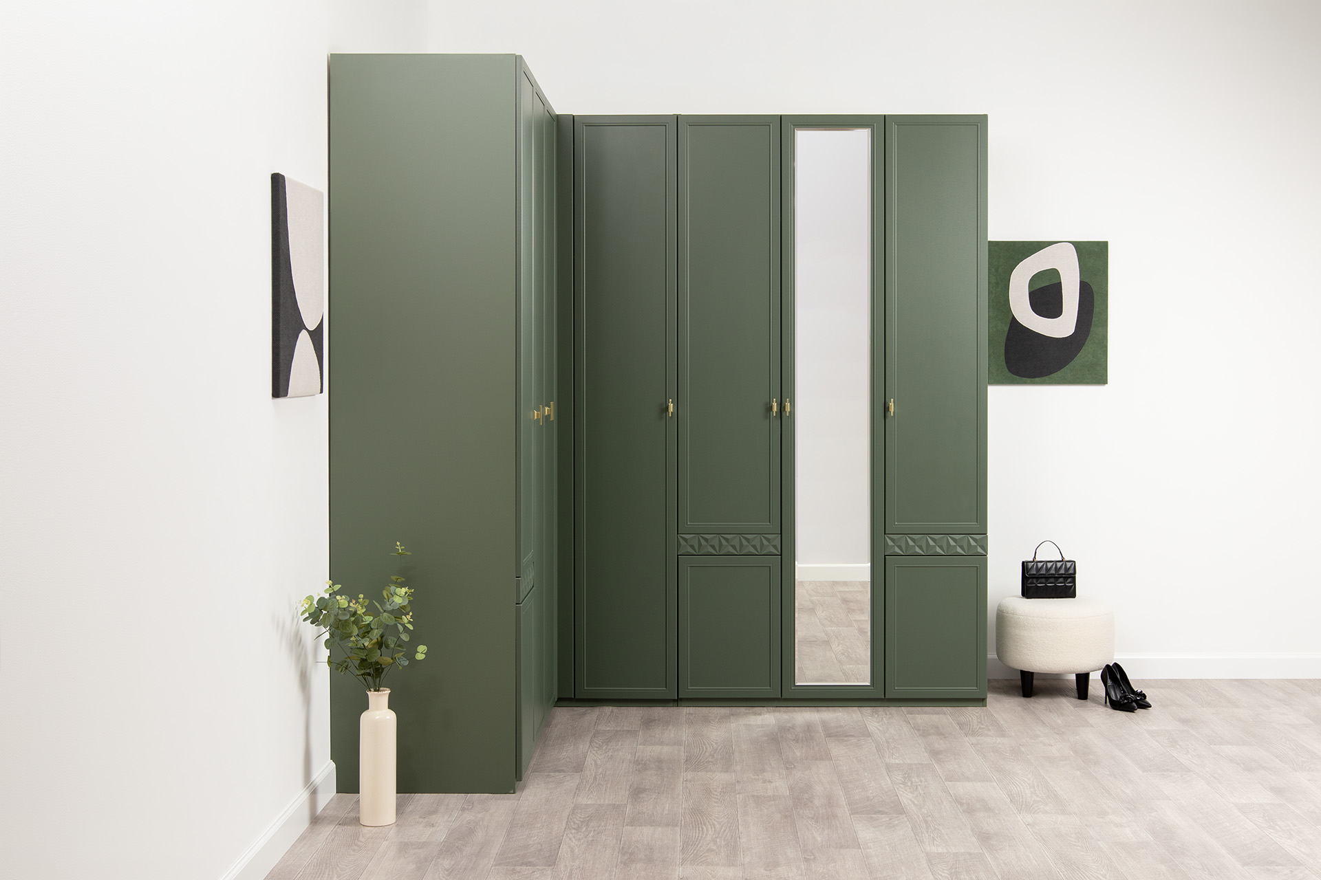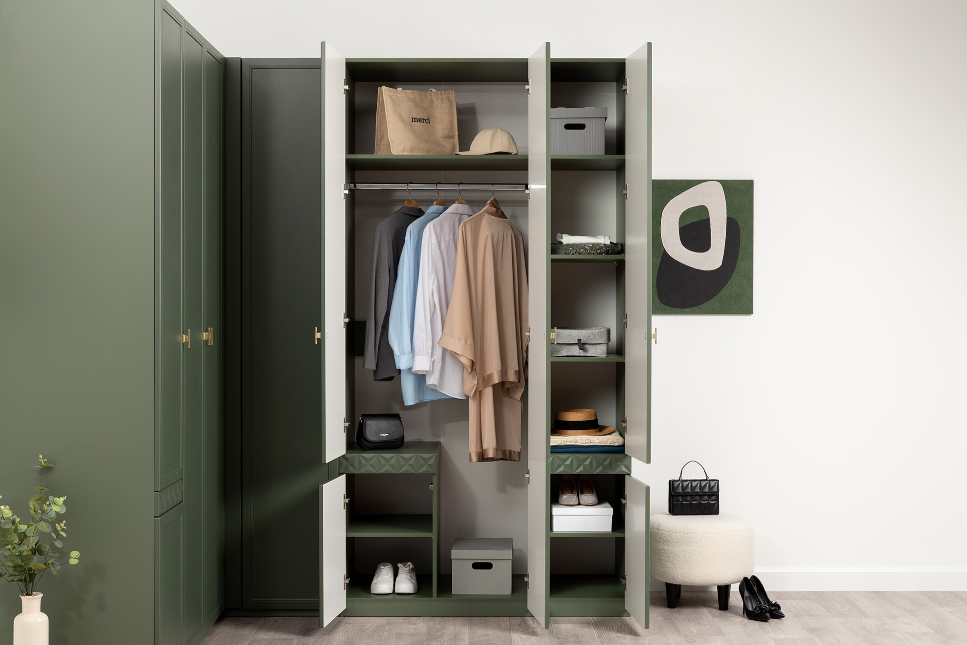 Шкаф для одежды Марион 16.340.03 дымчатый зеленый K521, олива шагрень AG 1050 ПВХ (собирается на любую сторону)