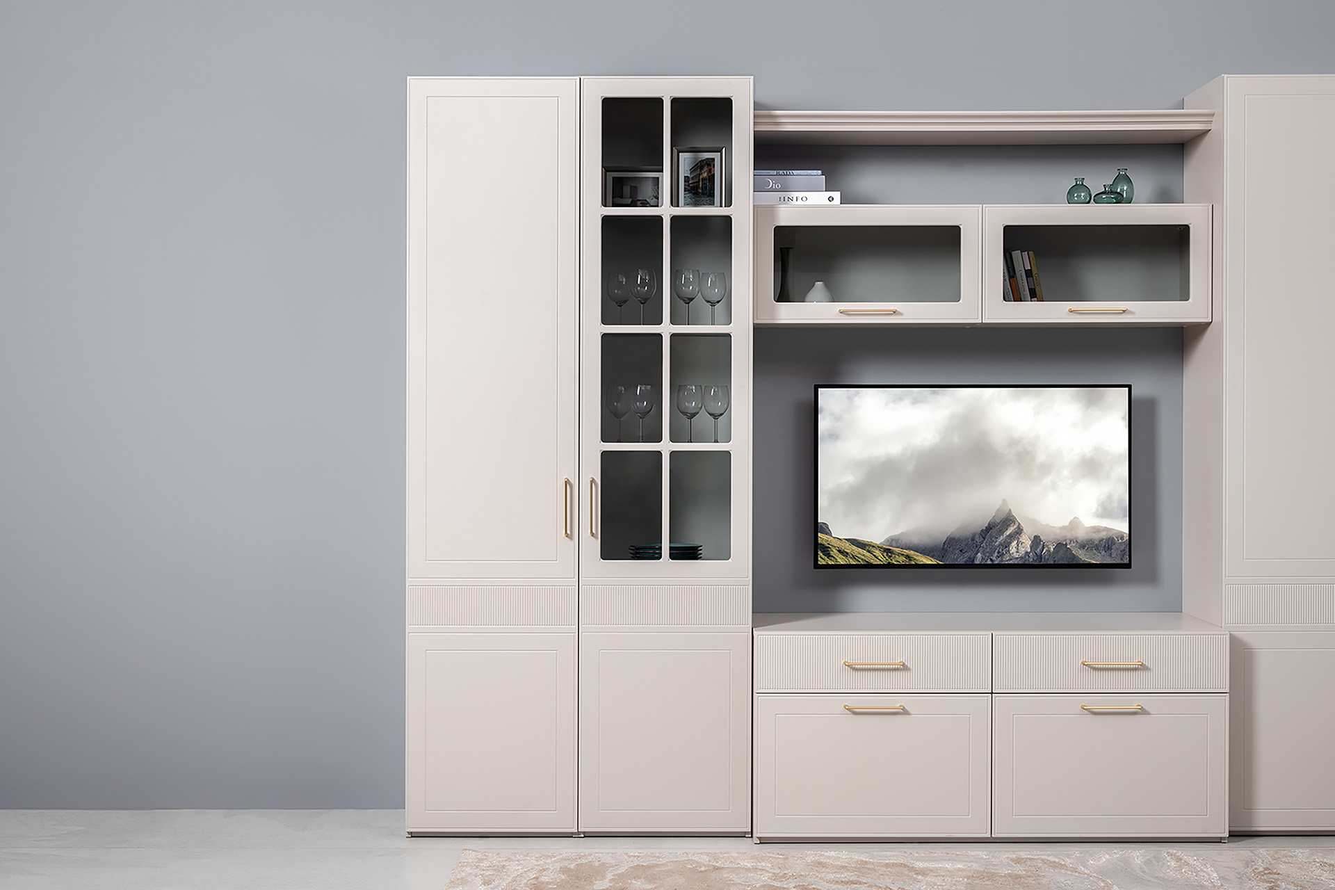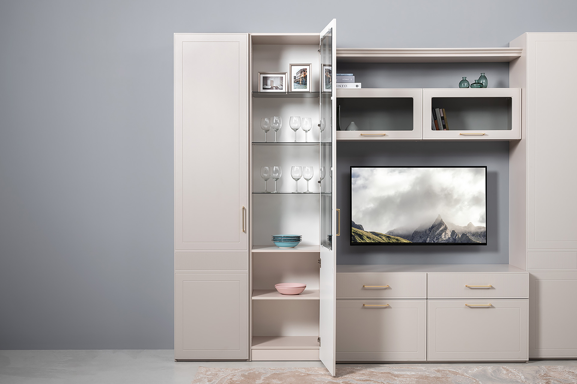 Фрезерованные фасады из МДФ, металлические ручки и витрины с тонированным стеклом создают изысканный образ.